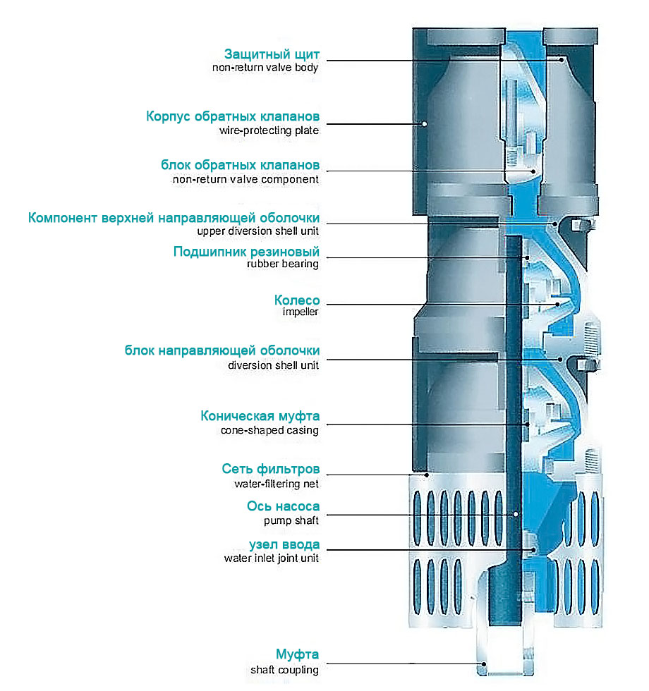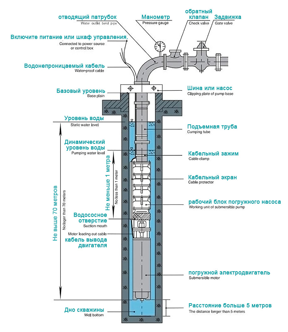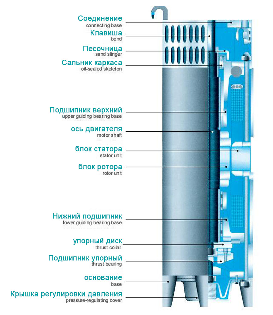 1. Máy bơm điện dưới nước bao gồm năm bộ phận: máy bơm nước, động cơ, đường nước, cáp chống nước và công tắc điều khiển. Máy bơm là máy bơm ly tâm trục đứng đa tầng cánh hút đơn ba xi-lanh.