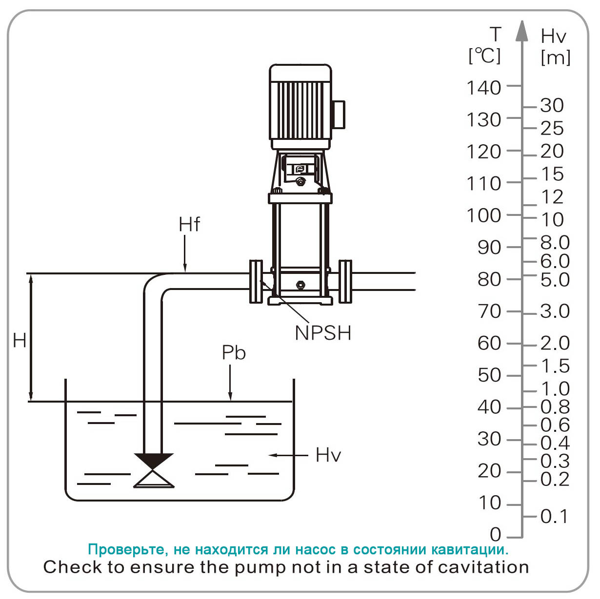 Nếu áp suất trong máy bơm thấp hơn áp suất bay hơi của chất lỏng được bơm thì hiện tượng xâm thực có thể xảy ra. Để tránh hiện tượng xâm thực, hãy đảm bảo rằng phía hút của máy bơm được duy trì ở áp suất tối thiểu. Giá trị tối đa của H [m] có thể được tính bằng công thức dưới đây.
