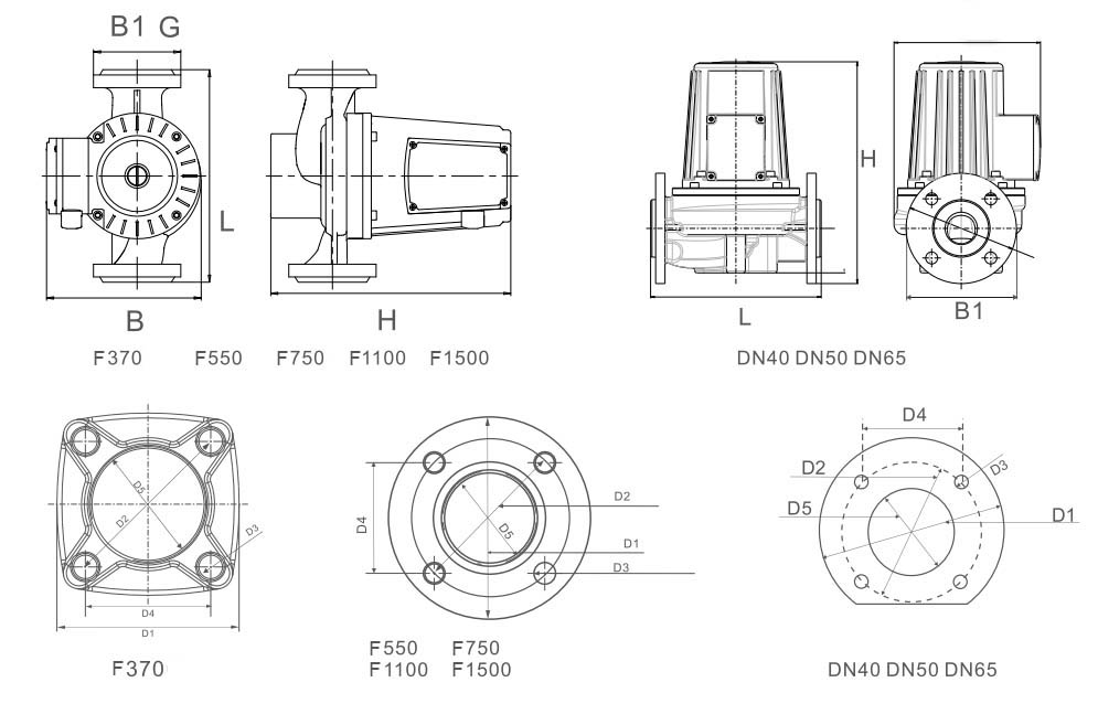 | (W) | (m³/h) | (m) | 220V/50Hz | 220V/60Hz | 380V/50Hz | L | B | B1 | H | G | D1 | D2 | D3 | D4 | D5 | ||